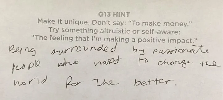 Answer: Being surrounded by passionate people who want to change the world for the better.