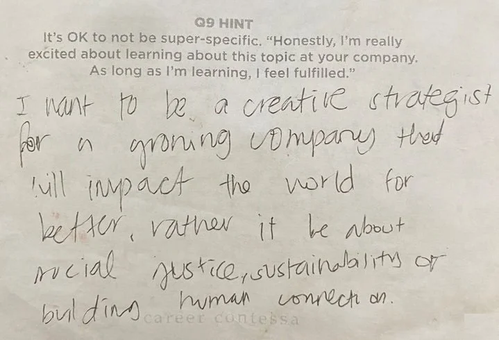 Answer: I want to be a creative strategist for a growing company that will impact the world for better, rather it be about social justice, sustainability or building human connection.